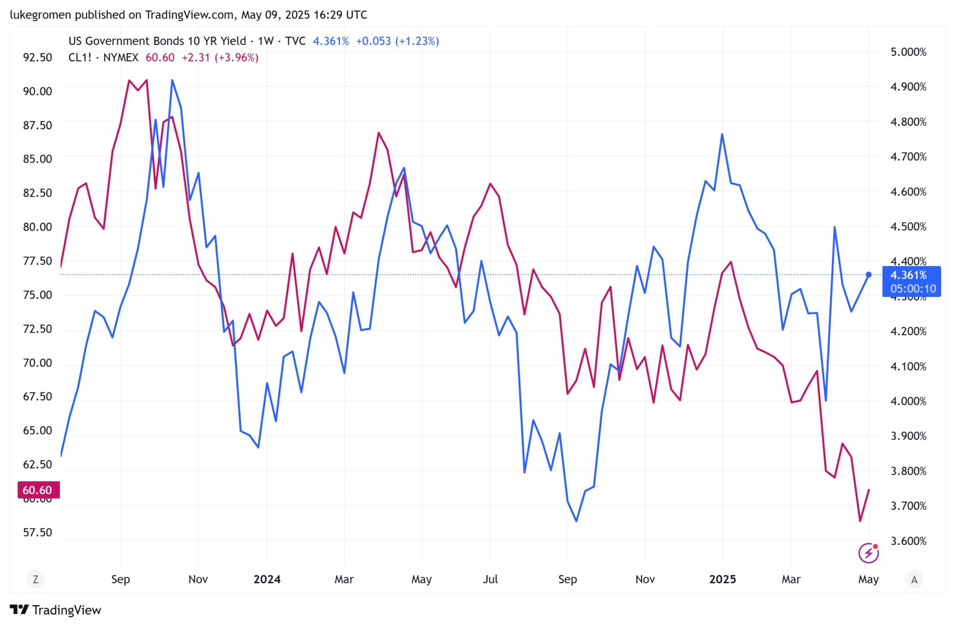 Wykres rentowności 10-letnich amerykańskich obligacji skarbowych (niebieski, RS) w porównaniu z ropą naftową (czerwony, LS) pokazuje, dlaczego Putin nadal ma większą dźwignię, niż Wall Street czy Washington są skłonne przyznać: sankcjonowanie rosyjskiej ropy prawdopodobnie spowodowałoby, że rentowność 10-letnich amerykańskich obligacji skarbowych osiągnęłaby poziomy, które wywołałyby spiralę zadłużenia USA (i globalnego).
