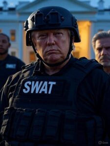 Najnowsze obrazy Trumpa generowane przez sztuczną inteligencję, udostępniane na jego kontach w mediach społecznościowych, przedstawiają go w zmilitaryzowanym czarnym mundurze funkcjonariusza SWAT (fot.) lub w mundurze policyjnym.