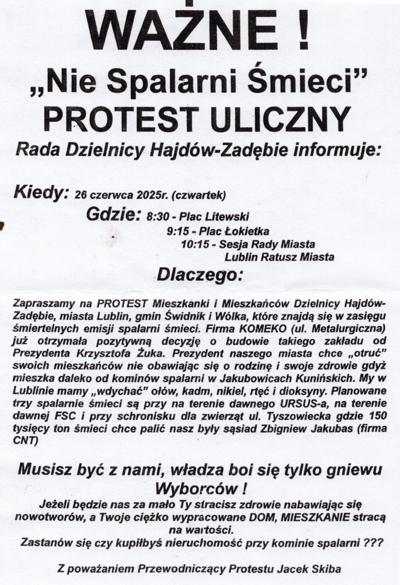Ochrona środowiskaPolecane Protest uliczny – jedyna droga do popsucia trujących interesów 25/06/25 ... 0 Comments Krzysztof Żuk, Lublin, Świdnik ofiarą zanieczyszczeń, Zbigniew Jakubas, zespół spalarni śmierci w Lublinie370 Views (Visited 55 times, 1 visits today)